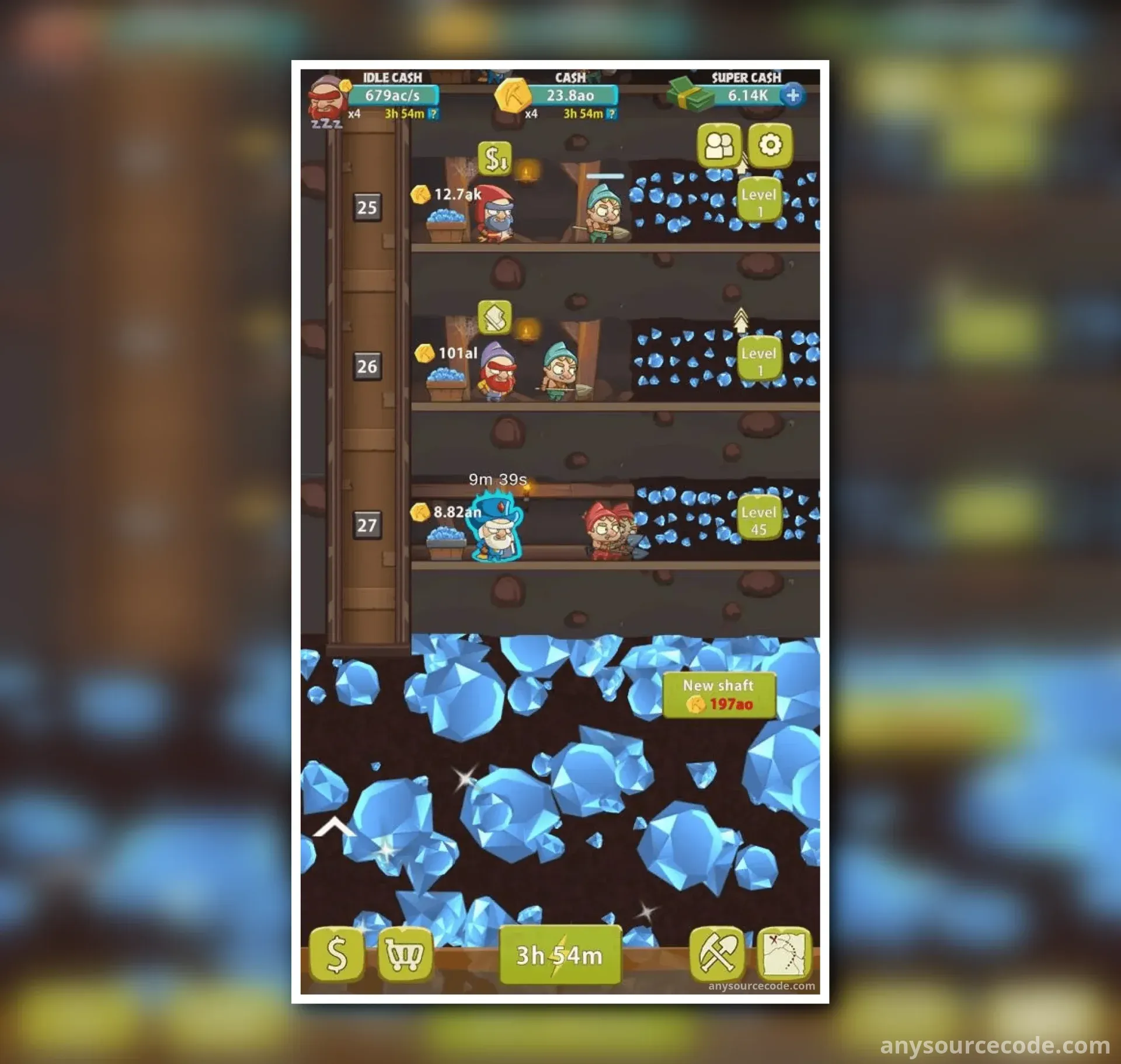 - Upgrade shafts, elevators, and warehouses in each mine to increase idle cash flow.