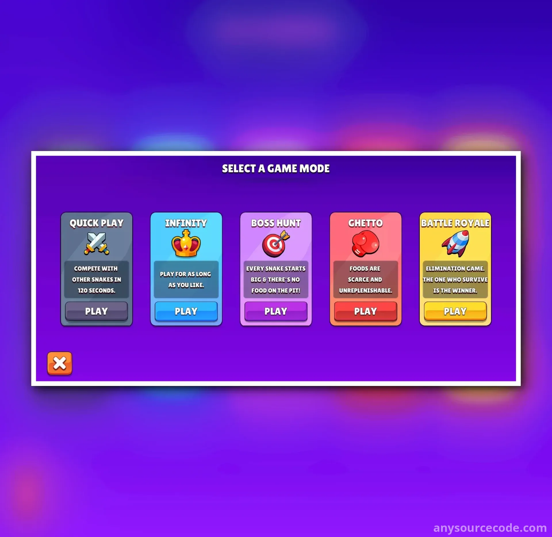 - Quick Play: Default game mode with normal settings; food respawns upon pickup, bot snakes revive, and game timer counts down from 120 seconds.