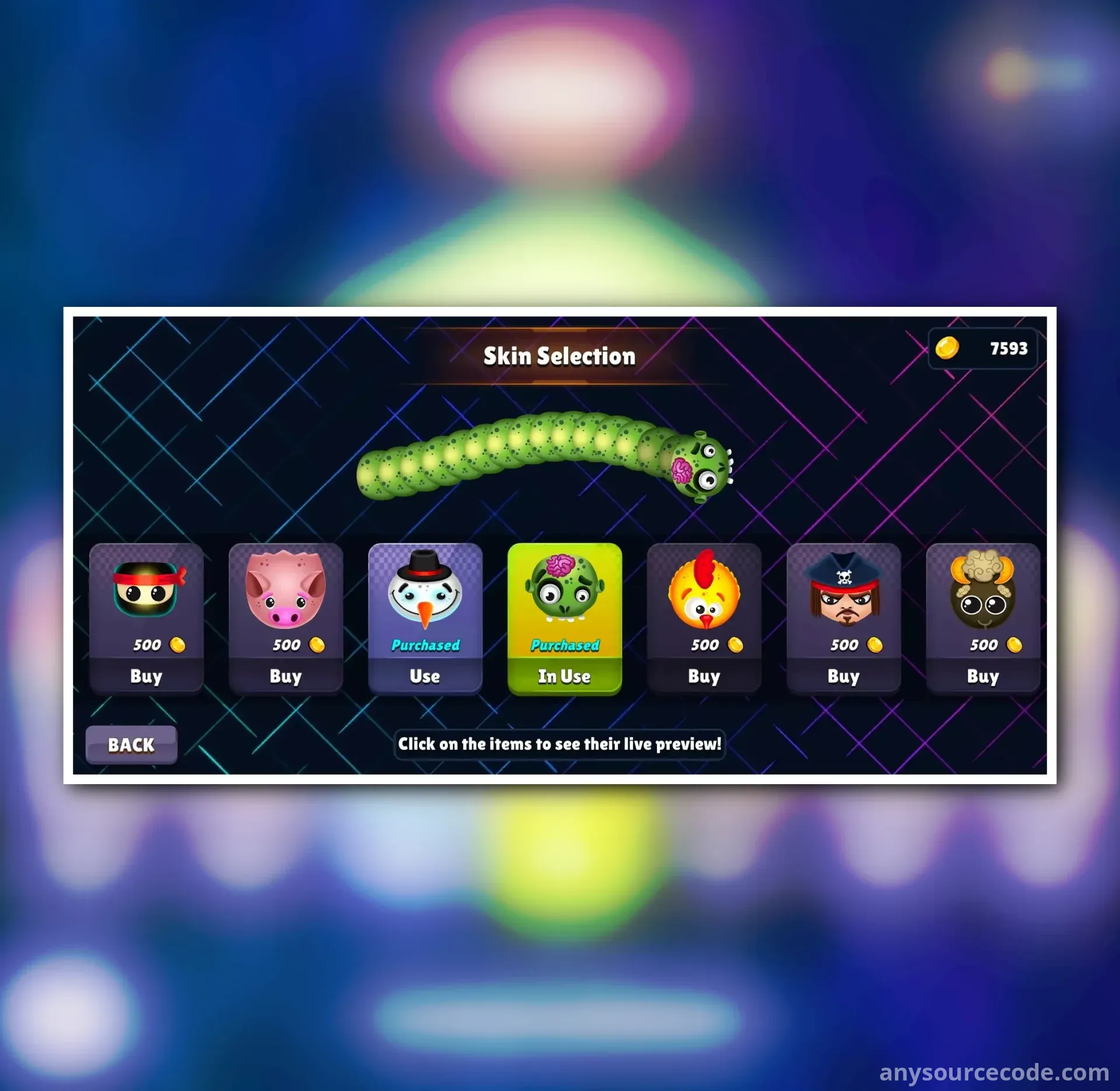 - In-game skin shop for players to exchange coins for skins