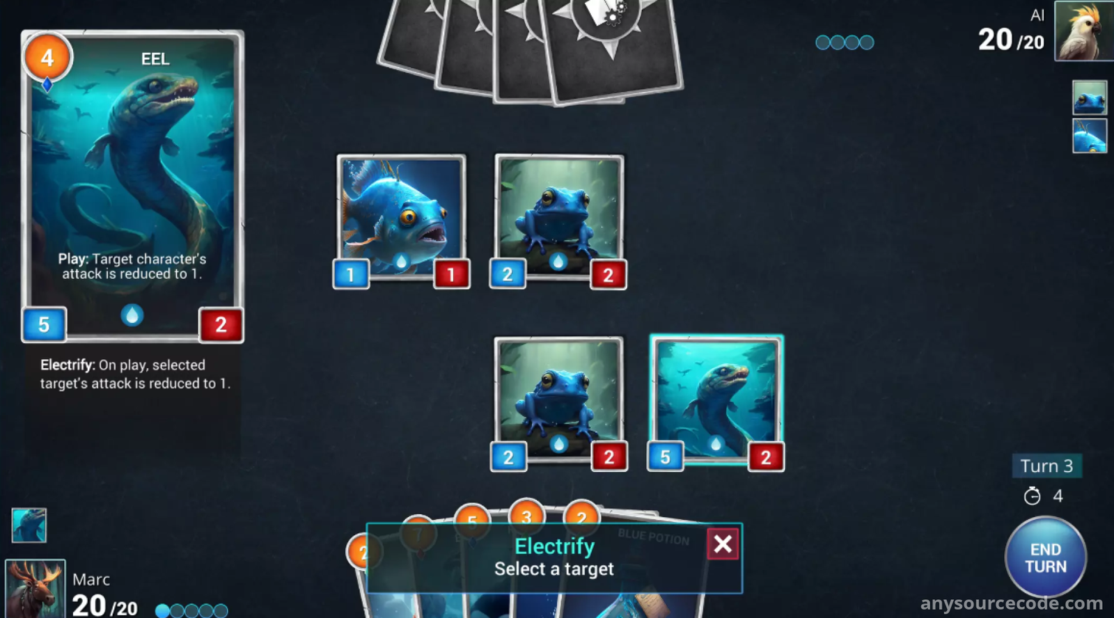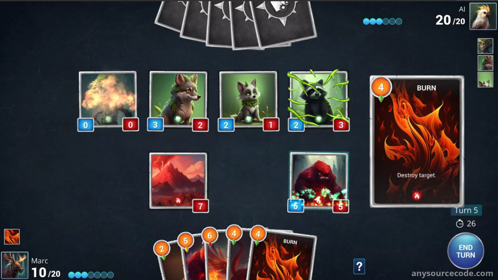 -Card game gameplay (Play, Attack, Mana, HP, Abilities)