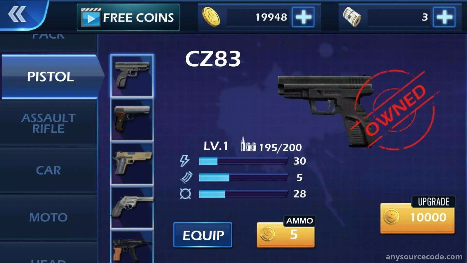- Choose from a variety of pistols and upgrade them with coins